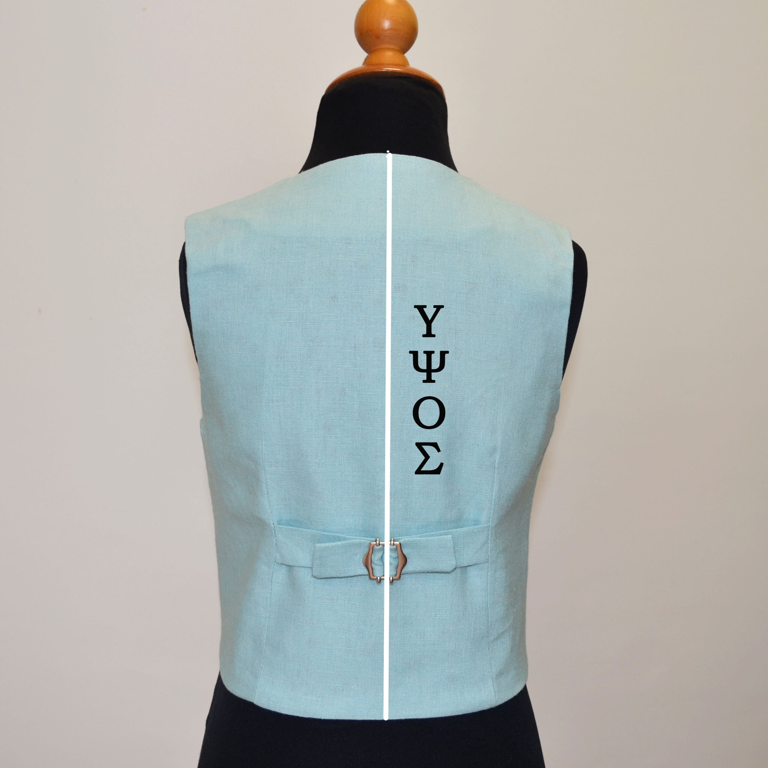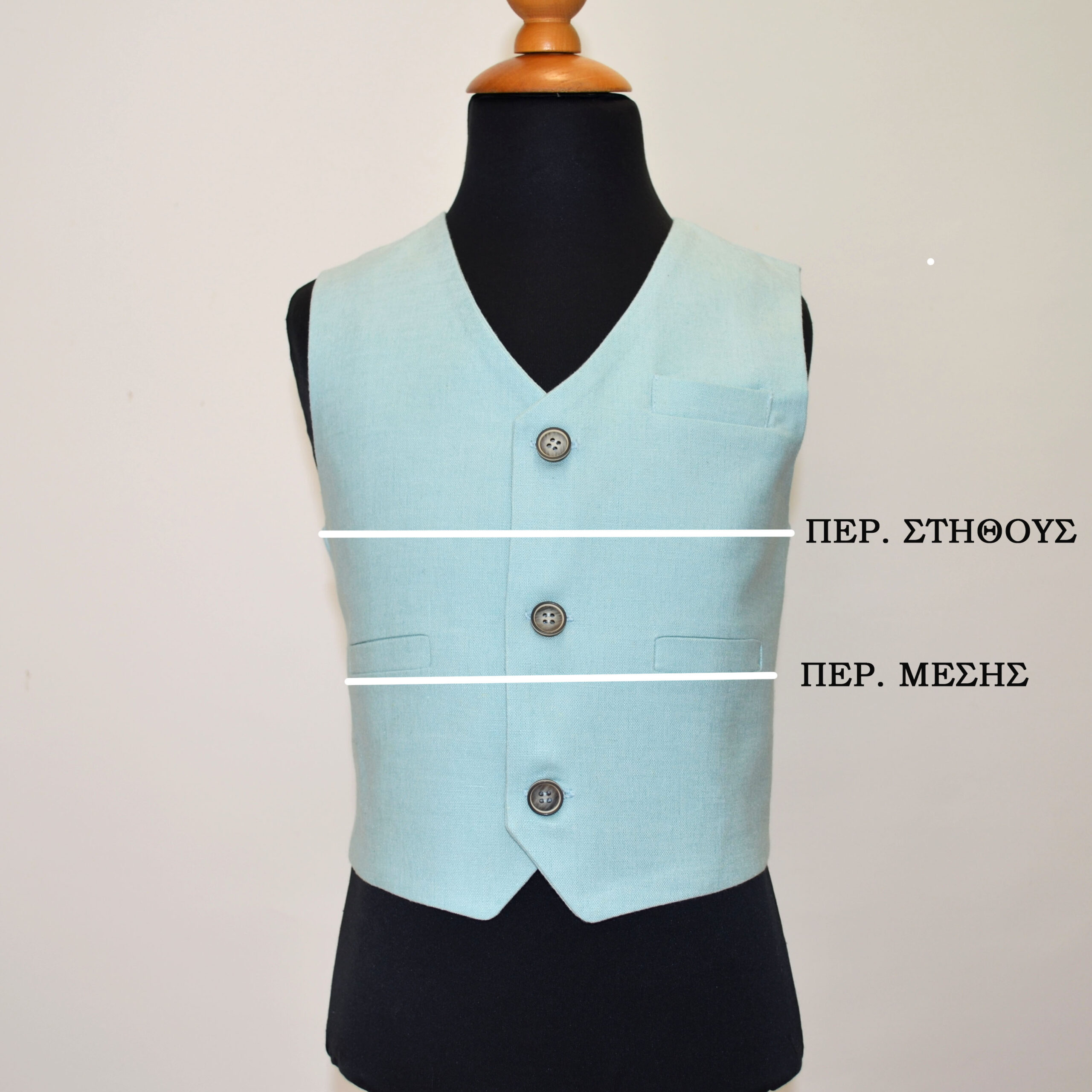 Παιδικό Γιλέκο Λινό Πέτο –Γιακά από ύφασμα σε μπλε τόνους με το σχέδιο της ύφανσης να δημιουργεί πουά. Άνοιγμα εμπρός με κουμπιά, τσέπες φιλέτο και φόδρα από βαμβακερό ύφασμα. Ζωνάκι στο πίσω μέρος που αυξομειώνει.